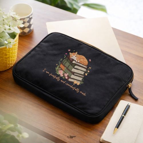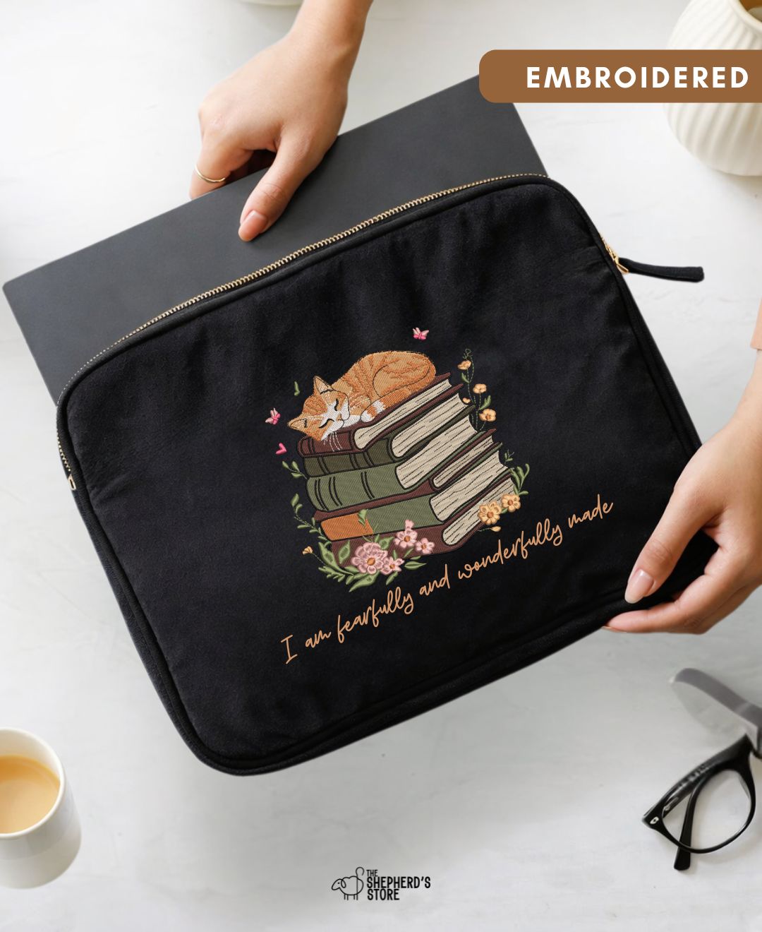 Each sleeve features a beautifully embroidered scripture-inspired design, adding meaning to a minimal aesthetic. Finished with a metal zipper and chain runner, it ensures your laptop stays secure while elevating your daily essentials. Designed for everyday use, this sleeve slips easily into your tote or backpack—making it a functional yet statement-worthy essential for work, travel, or study.