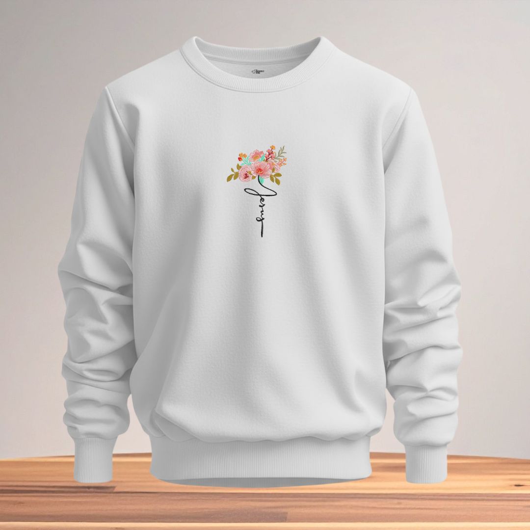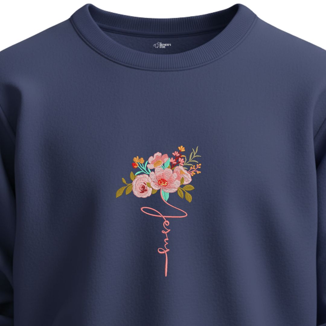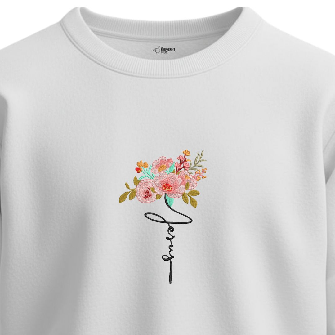 Soft, elegant, and meaningful. This floral “Jesus” embroidered sweatshirt combines beauty and devotion, celebrating the gentleness of Christ.